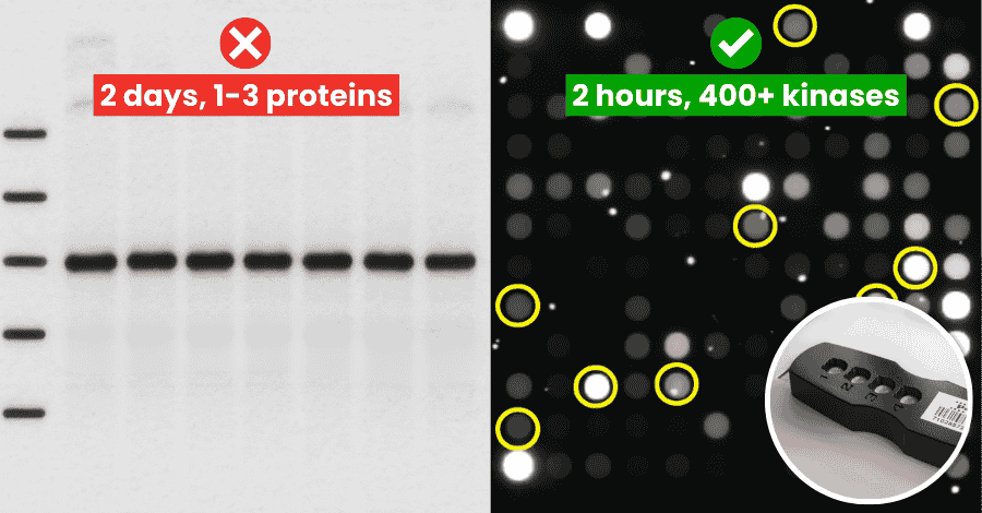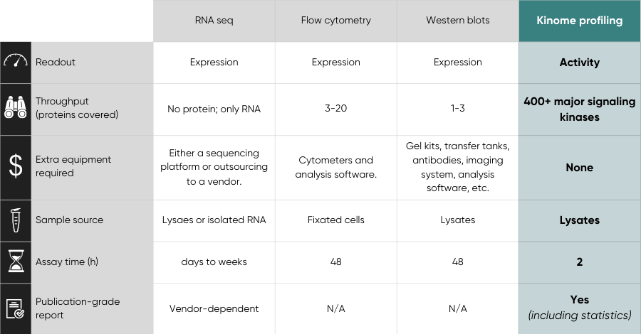 • RNA-seq measures expression. Kinome profiling measures activity (phosphorylation-driven signaling).• Flow cytometry measures phenotype. Kinome profiling helps explain which pathways drive the phenotype.• Western blots validate a few hypotheses. Kinome profiling helps you find which pathways to validate—and reduces antibody fishing.More details in the table below:
